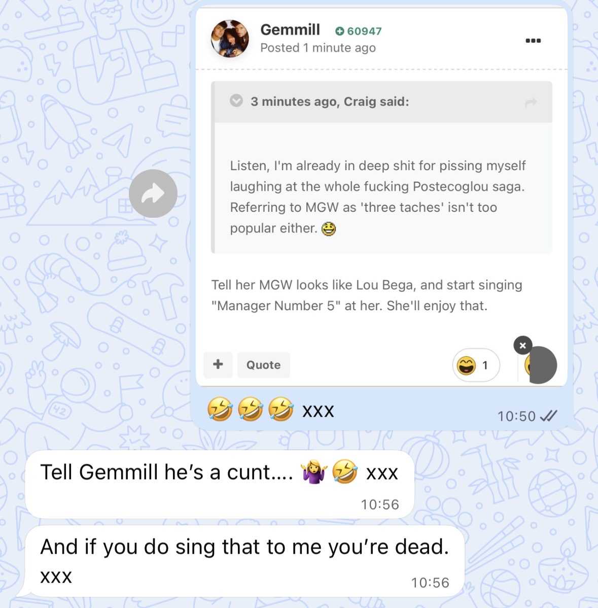Craig 12321 Posted October 29 Share Posted October 29 1 minute ago, Gemmill said: I'll be monitoring your posts closely for pro Forest bias. MARK MY WORDS! Listen, I'm already in deep shit for pissing myself laughing at the whole fucking Postecoglou saga. Referring to MGW as 'three taches' isn't too popular either. 2 Link to comment Share on other sites More sharing options...
