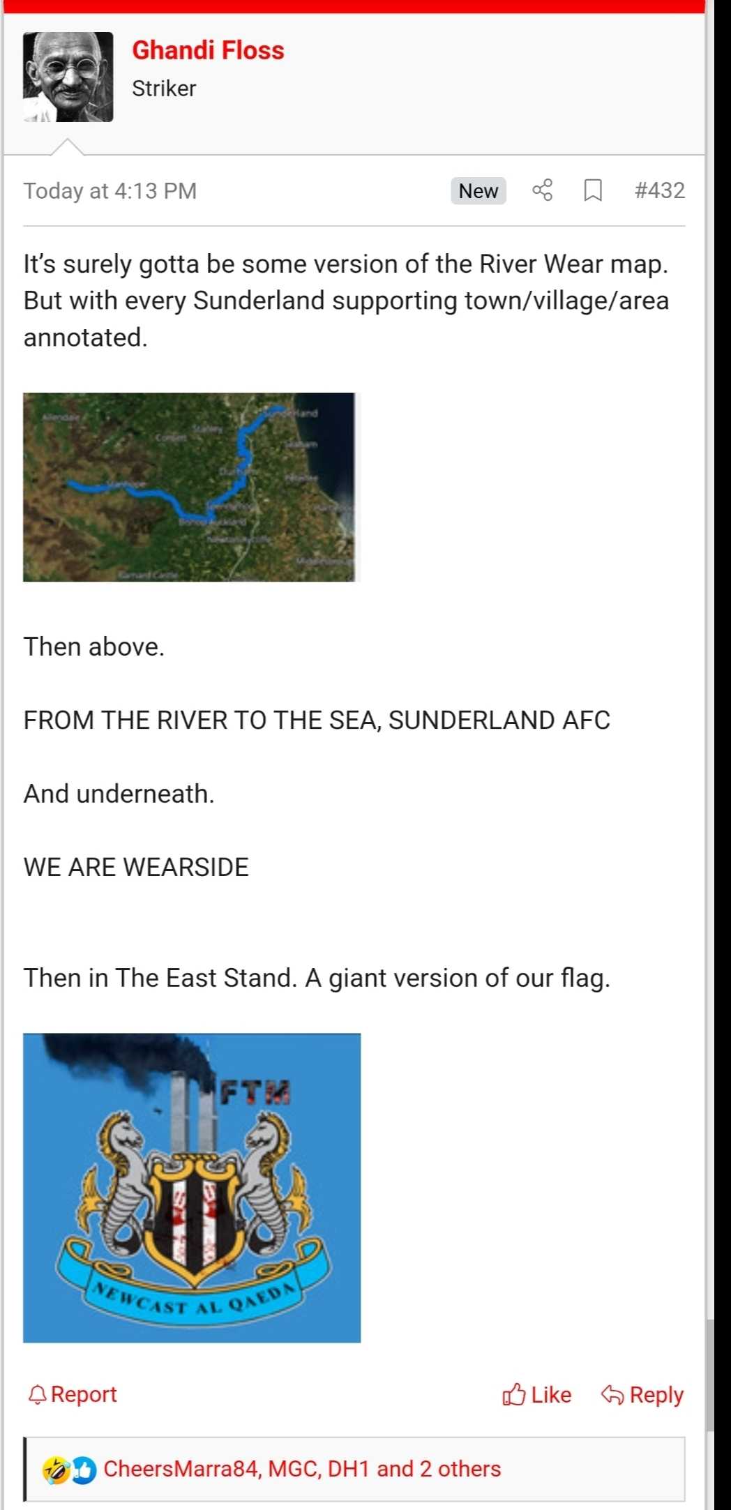 Renton 27739 Posted November 11 Share Posted November 11 Had a look at the SMB through my fingers tonight. You can imagine what it's like. They're very excited about the display for the derby, it's gonna be real classy marra. Nothing says classy like "FROM THE RIVER TO THE SEA, SUNDERLAND AFC" and the NUFC crest with the burning twin towers coming out of it. Jesus H tap dancing Christ man. 2 1 3 Link to comment Share on other sites More sharing options...