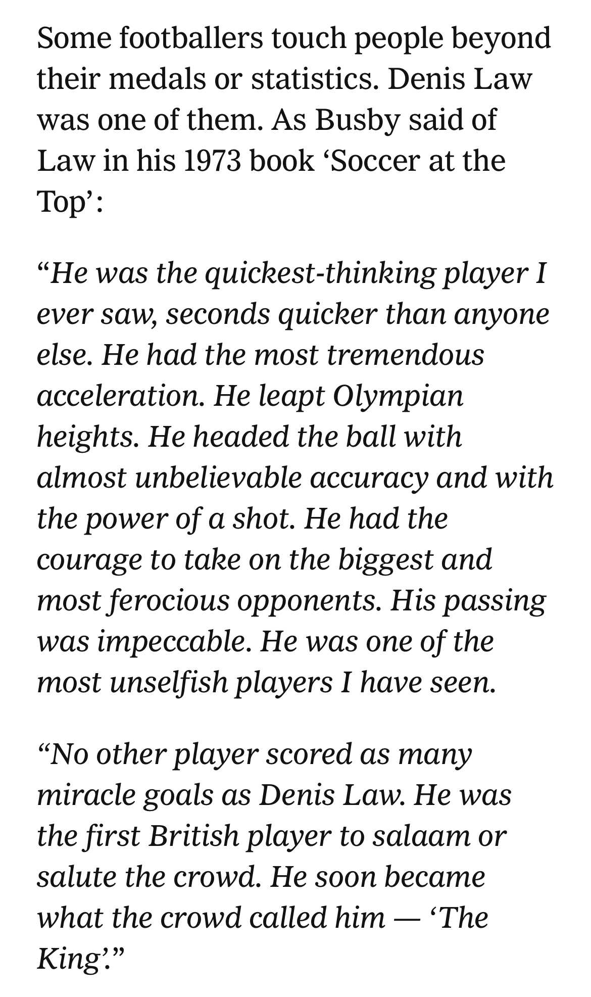 PaddockLad 22496 Posted January 17 Share Posted January 17 My dad’s favourite player . And my mum’s. Whenever the Lawman appeared on tv she would always say “oh yeah Denis Law, we used to see him in the clubs in town, he had a big blue jag…” RIP. One of Man Utd & Scotland’s greatest ever players 5 Link to comment Share on other sites More sharing options...