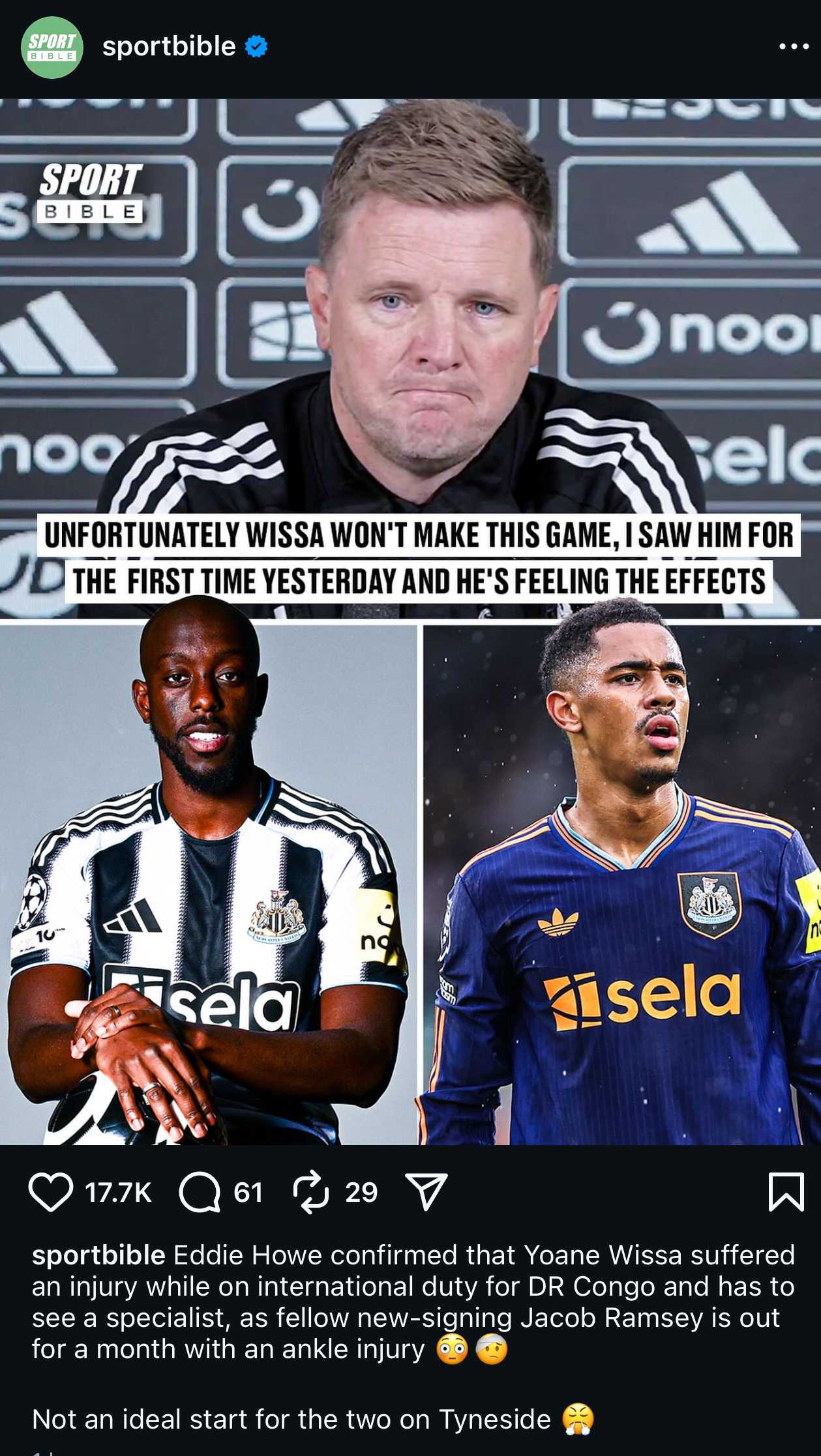 Gemmill 62983 Posted September 12 Share Posted September 12 https://www.espn.co.uk/football/story/_/id/46231874/newcastle-new-signing-yoane-wissa-injured-see-specialist ESPN and others reporting quotes about a specialist so maybe I was concentrating too much on work for once. Just a giant disaster if he's fucked. Link to comment Share on other sites More sharing options...
