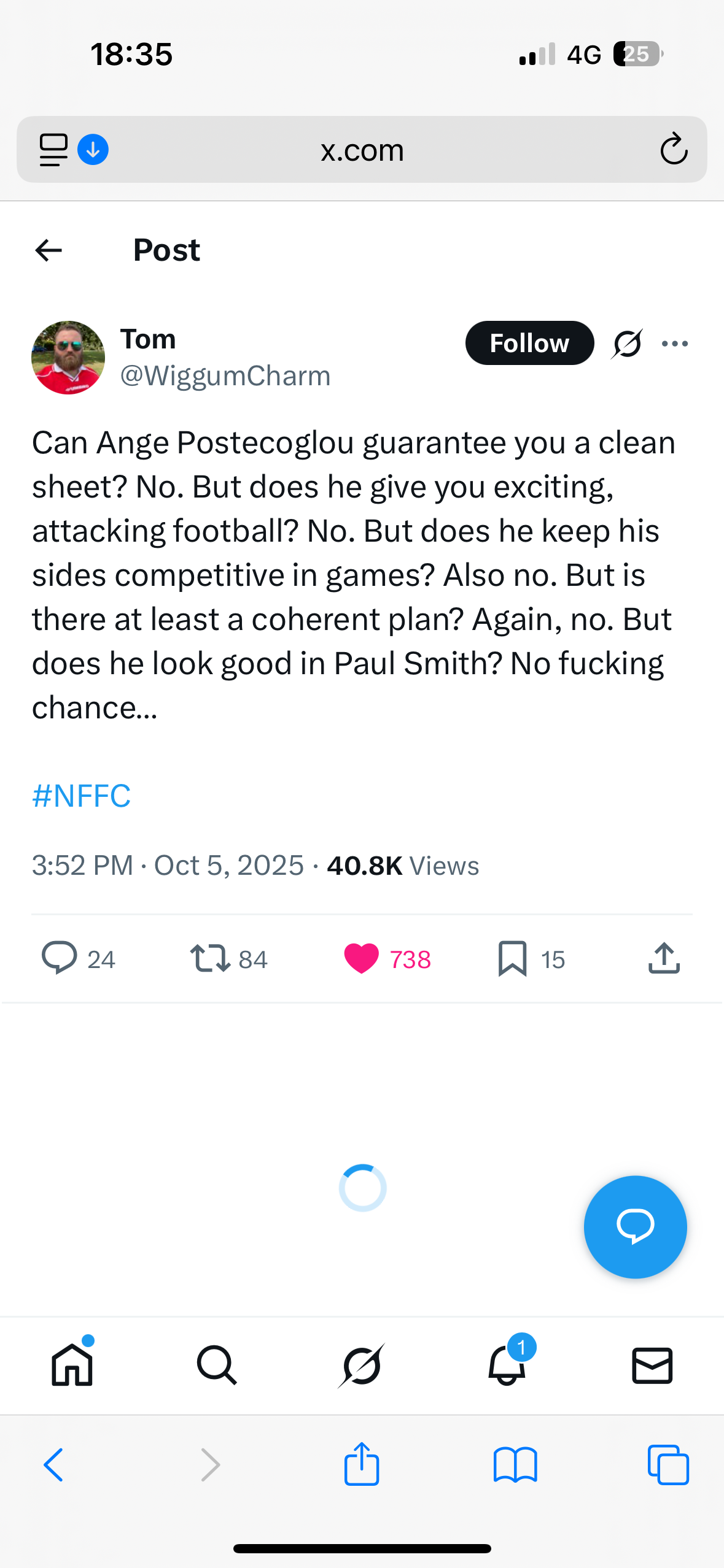Howmanheyman 43884 Posted October 6 Share Posted October 6 9 hours ago, David Kelly said: Dunno if this has been mentioned but I thought it was pretty shit that there wasn’t a minute’s silence/applause for McFaul today. Won the fairs cup with us, played over 290 games and managed us at time when we had jack shit. May not be Shearer or Milburn but I think he deserves a bit more than what we did for him today. I mentioned earlier if we had one or did I miss it? I totally agree with you, the amount of minute's silences/applause etc we have throughout a season these last few years a lot of the time with fuck all to do with anyone NUFC based and then yesterday nothing? They had black armbands so it's not as if they didn't know. A very poor look in my opinion and it seems unless you played in the 90s with a grandad collar or later on then the club doesn't want to know? Like how they treat some fans it doesn't shine a particular good light on NUFC despite the bullshit some CEOs will occasionally come out with about 'lifeblood' and other sound bites. 3 Link to comment Share on other sites More sharing options...