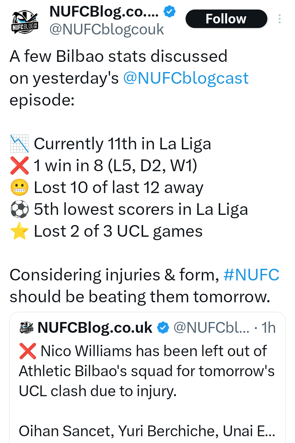 aimaad22 5948 Posted November 4 Share Posted November 4 Well then given the bug going around, Bilbao's own injury problems and the fact we really need to step up in the league I hope Howe makes a number of changes here. Plus the likes of Gordon need to get the message they need to get their act together and perform in the league. Link to comment Share on other sites More sharing options...